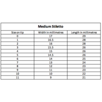 You will receive a bag of 504 Stiletto Medium Full Cover Clear Gel Tips (sculpted shape) split into 12 sizes. You will receive the following numbered sizes: 0, 1, 2, 3, 4, 5, 6, 7, 8, 9, 10 and 11.