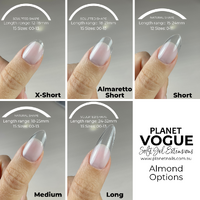 Shape & length comparisons: Please refer to the comparison photos and measurement chart before purchasing. Descriptive names (e.g. X-Short) reflect where a shape sits within the Planet Vogue range and may not align with other brands or individual expectations. When comparing lengths across brands, ensure you are comparing the same shape (e.g. X-Short Almond to X-Short Almond), as some shapes run longer across the board.
