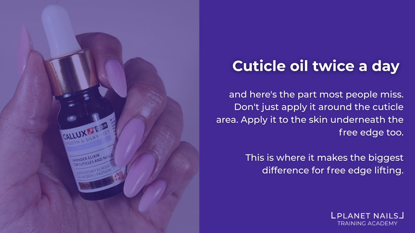 Pro Tip: Recommend cuticle oil twice daily — and here's the part most people miss. It's not just about applying it around the cuticle area. Clients need to apply it to the skin underneath the free edge too. This is where it makes the biggest difference for free edge hydration. Keep the nail flexible and it's much less likely to curl away from the product. Results can be seen in as little as two weeks — your client could be saying goodbye to free edge lifting by their very next infill appointment.