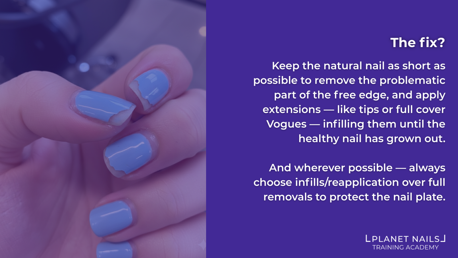Pro Tip: Keep the natural nail as short as possible to remove the problematic portion of the free edge and apply extensions such as tips or full cover soft gel extensions, infilling them until the healthy nail has grown out. And wherever possible — always choose infills over full removals to protect the nail plate and avoid compounding the issue.