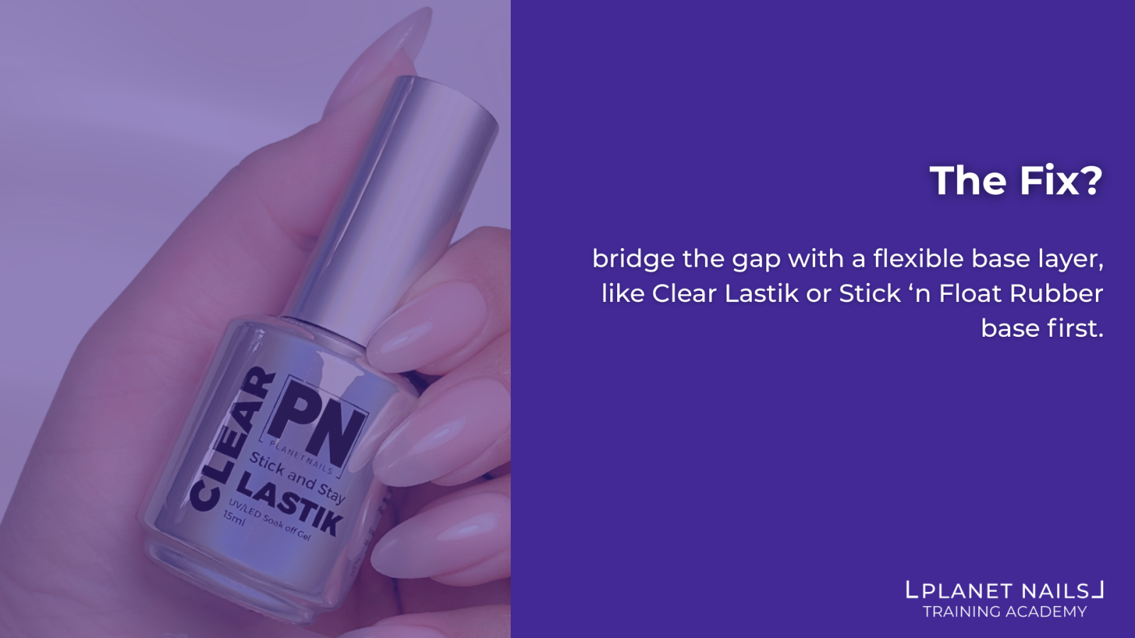 Pro Tip: Bridge the gap with a flexible base layer first. Products like Lastik or Stick 'n Float rubber base are designed to move with the natural nail while still giving the harder builder gel something compatible to bond to. Apply a thin layer of flexible base, cure it properly, then apply your builder gel as normal. The flexible base absorbs the flex, so the harder product doesn't have to — making a significant difference for clients who are prone to lifting in this area. These two products work under Acrylic enhancements in the exact same way.