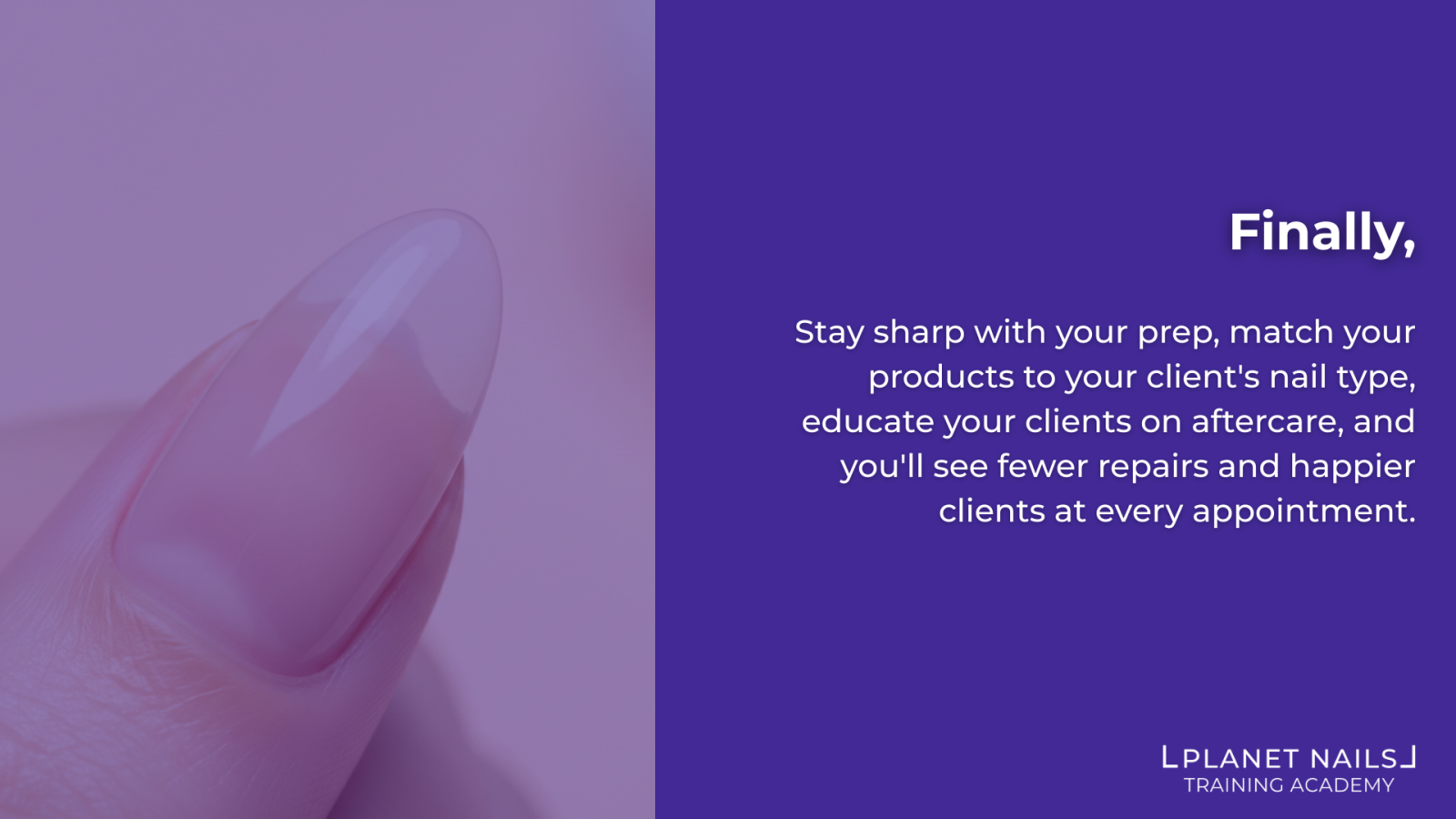 Stay sharp with your prep, match your products to your client's nail type, educate your clients on aftercare, and you'll see fewer repairs and happier clients at every appointment.