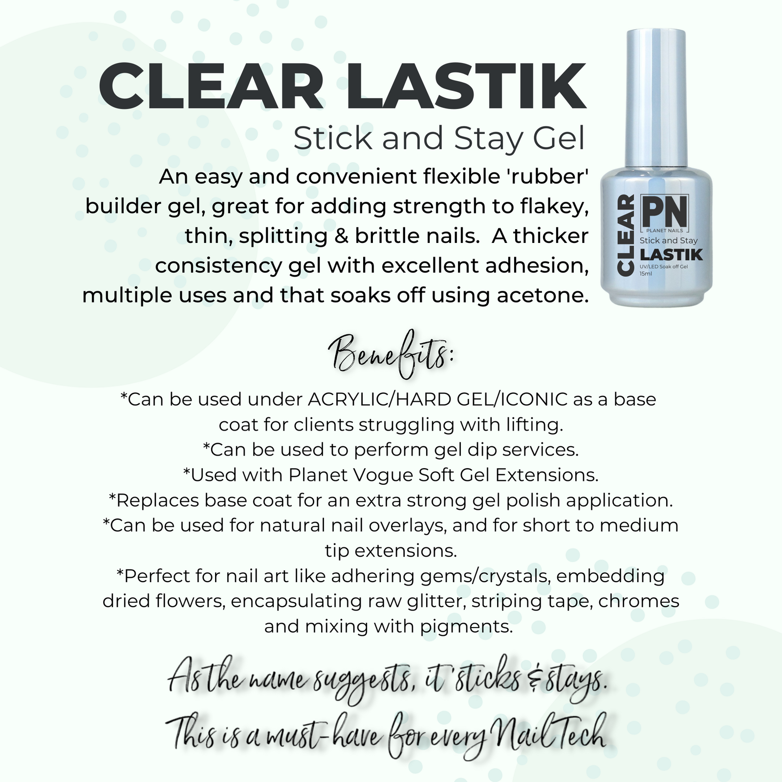 This is a staple for many of our clients.  Planet Nails Lastik is an incredible product that once you’ve tried it, you will always use it.