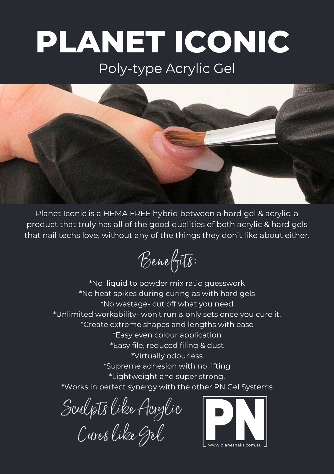 Planet Iconic is a HEMA FREE hybrid between a hard gel & acrylic, a product that truly has all of the good qualities of both acrylic & hard gels that nail techs love, without any of the things they don’t like about either.