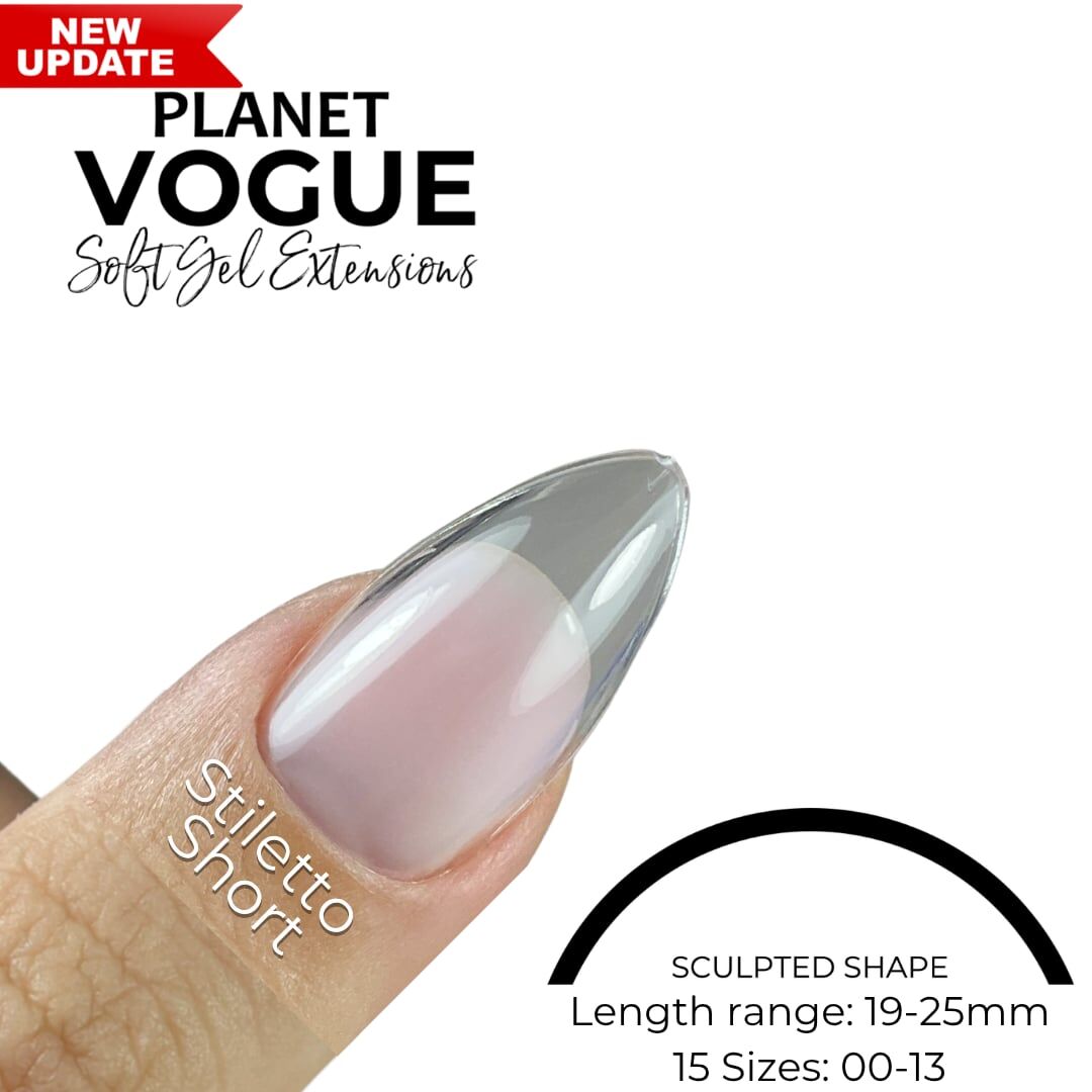 This is an updated shape and now comes in black bags. Planet Vogue is a nail system where a specialised full-cover tip is adhered to the natural nail using a soft gel — use LASTIK Stick & Stay Gel, or, for a HEMA-free option, use LASTIK HF. This system is often referred to as Soft Gel Extensions.